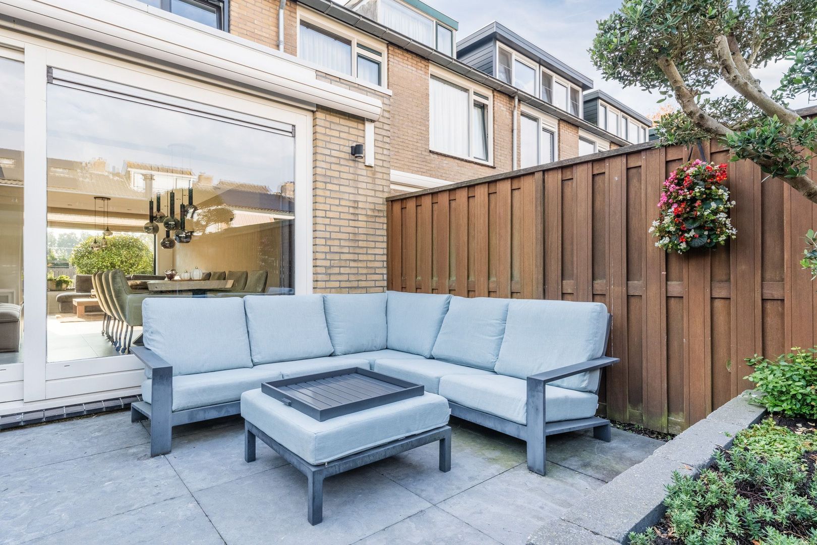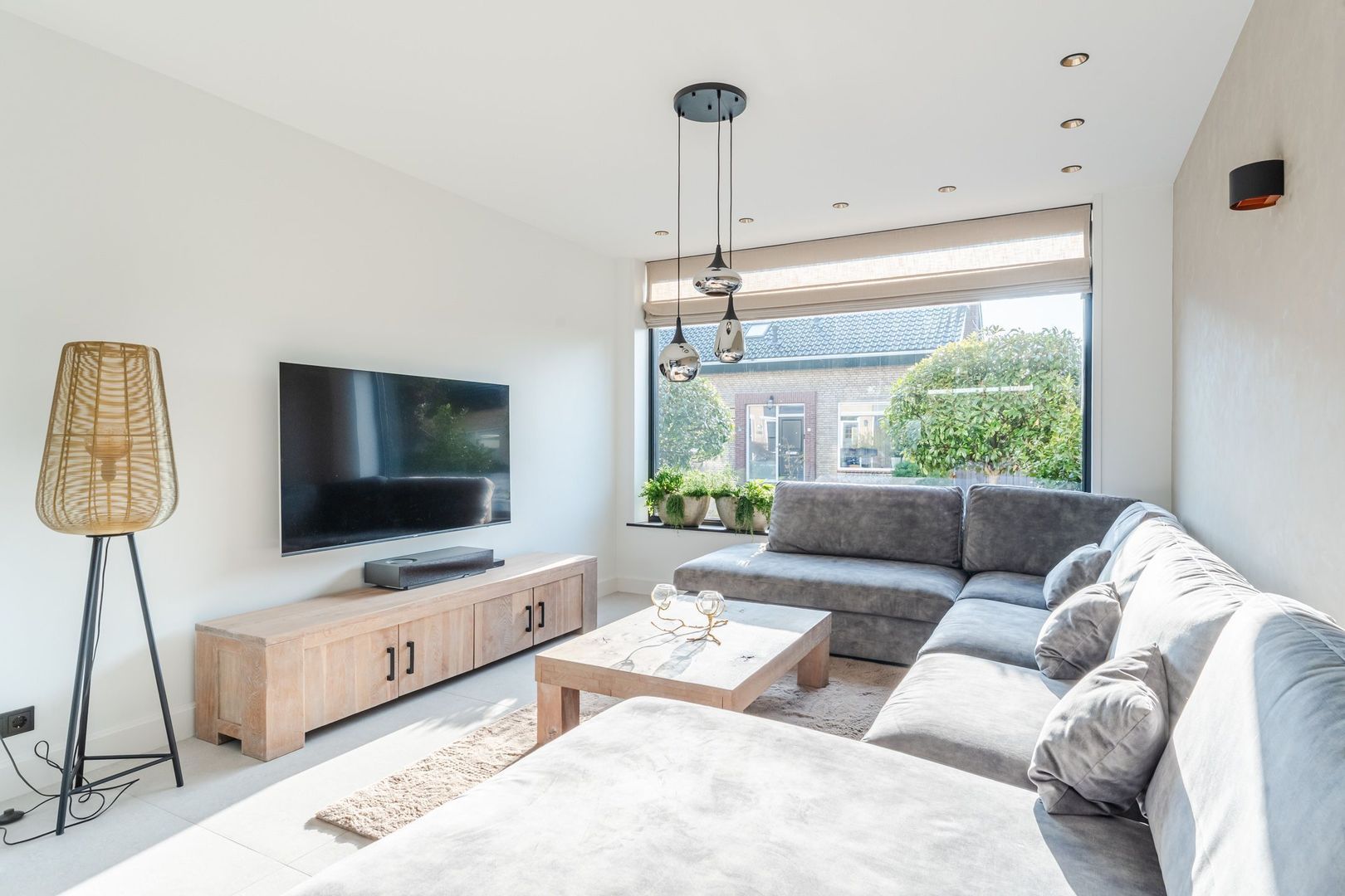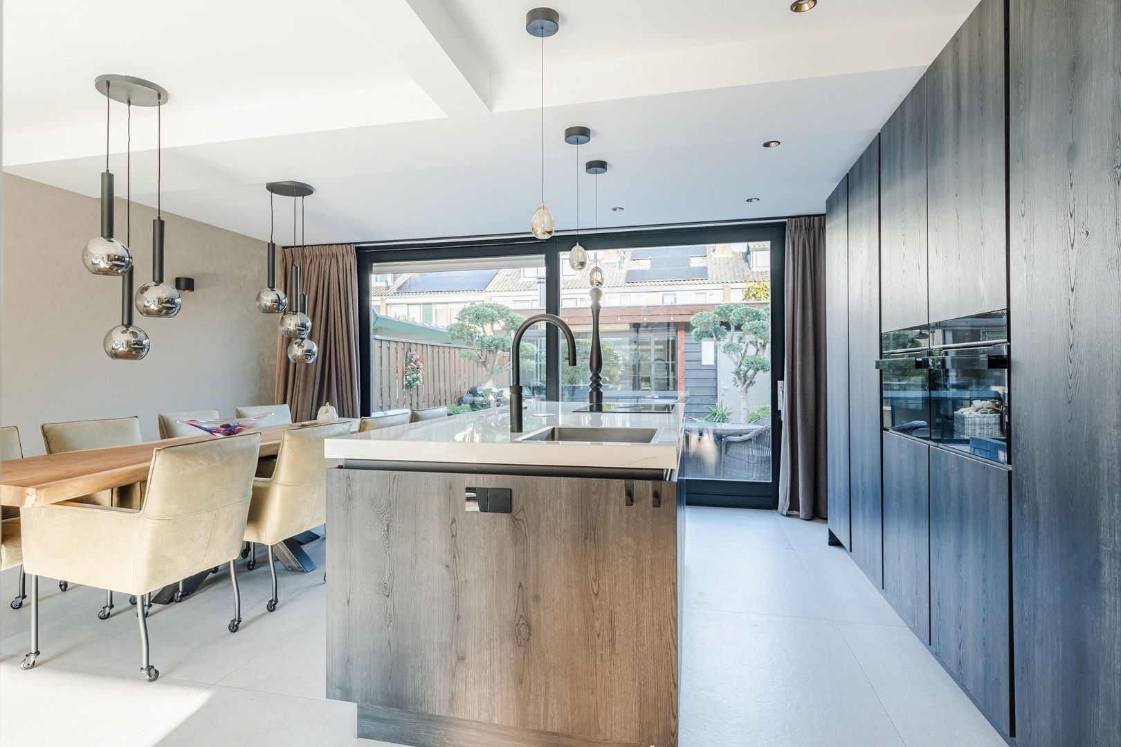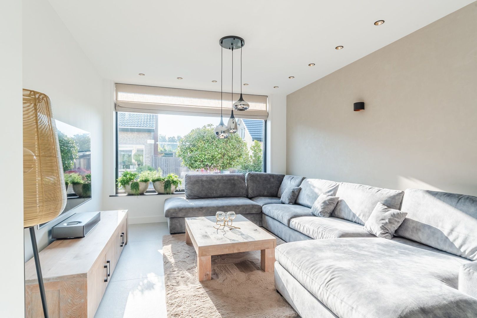 Begane grond: volledig gerenoveerd in 2023!! entree, hal met meterkast, een vernieuwde trapopgang met eiken treden, trapkast en aparte geheel betegelde toiletruimte (2023) v.v. wandcloset en fonteintje. Ruime uitgebouwde L-vormige woon-/eetkamer bestaande uit het zitgedeelte a/d voorzijde en een prachtige woonkeuken a/d achterzijde die middels een schuifpui toegang geeft tot de achtertuin. In de keuken is een fraaie donkere keukenopstelling (2023) geplaatst v.v. koelkast, vriezer, stoomoven, combi-magnetron en een kookeiland met vaatwasser, quooker, composieten aanrechtblad en een luxe BORA kookplaat met ingebouwde afzuiging. De fraai ingerichte achtertuin is gesitueerd op het noordwesten en v.v. een sfeervolle veranda met geïntegreerde berging. De begane grond is afgewerkt met lichtgrijze vloertegels (1,20 x 1,20) met vloerverwarming en sfeervolle inbouwverlichting.