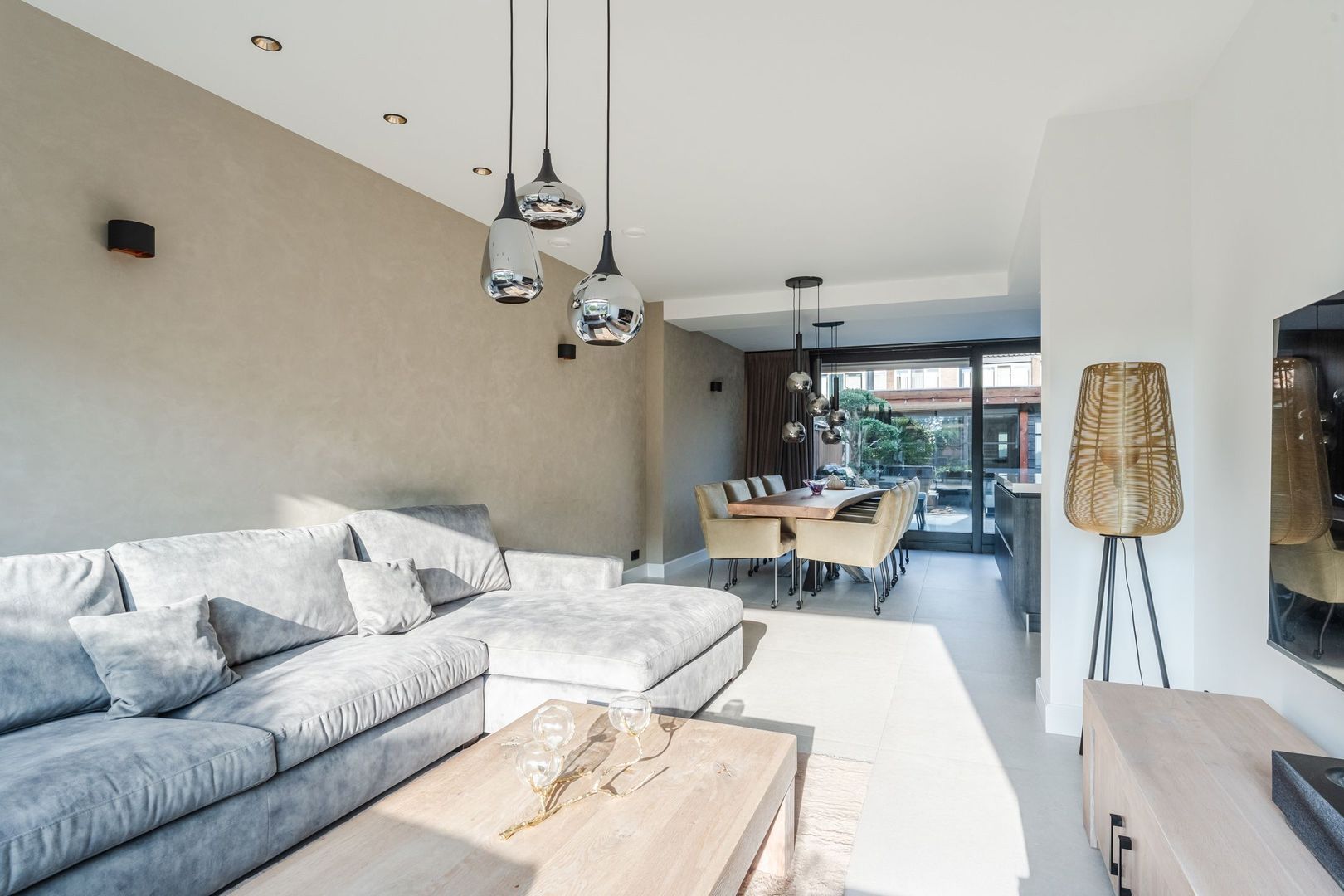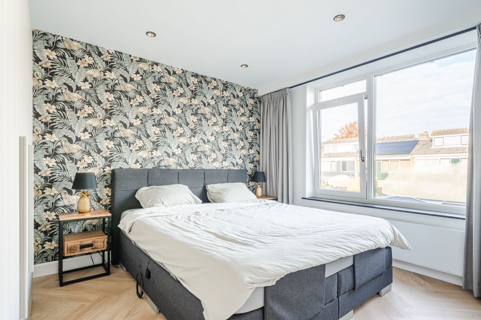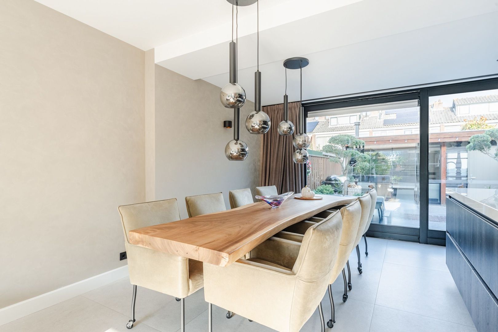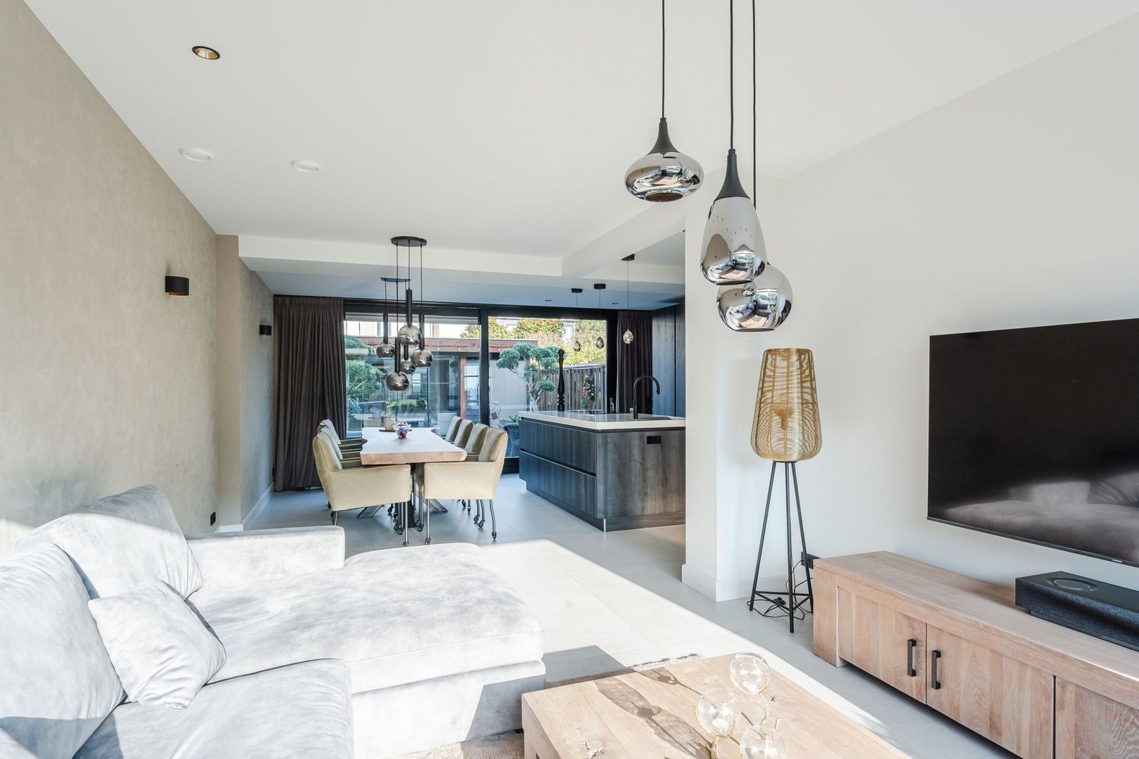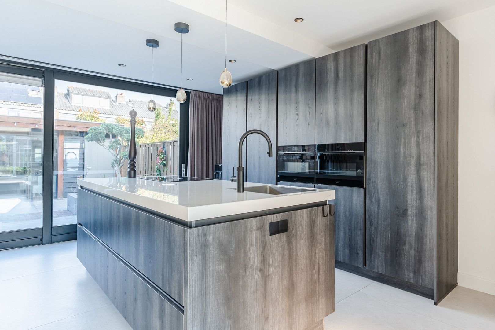 Begane grond: volledig gerenoveerd in 2023!! entree, hal met meterkast, een vernieuwde trapopgang met eiken treden, trapkast en aparte geheel betegelde toiletruimte (2023) v.v. wandcloset en fonteintje. Ruime uitgebouwde L-vormige woon-/eetkamer bestaande uit het zitgedeelte a/d voorzijde en een prachtige woonkeuken a/d achterzijde die middels een schuifpui toegang geeft tot de achtertuin. In de keuken is een fraaie donkere keukenopstelling (2023) geplaatst v.v. koelkast, vriezer, stoomoven, combi-magnetron en een kookeiland met vaatwasser, quooker, composieten aanrechtblad en een luxe BORA kookplaat met ingebouwde afzuiging. De fraai ingerichte achtertuin is gesitueerd op het noordwesten en v.v. een sfeervolle veranda met geïntegreerde berging. De begane grond is afgewerkt met lichtgrijze vloertegels (1,20 x 1,20) met vloerverwarming en sfeervolle inbouwverlichting.