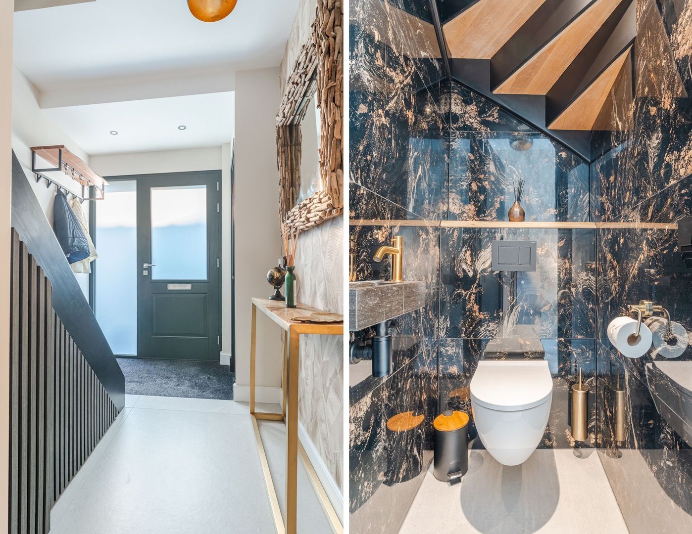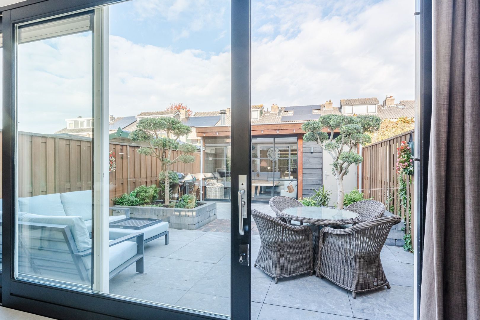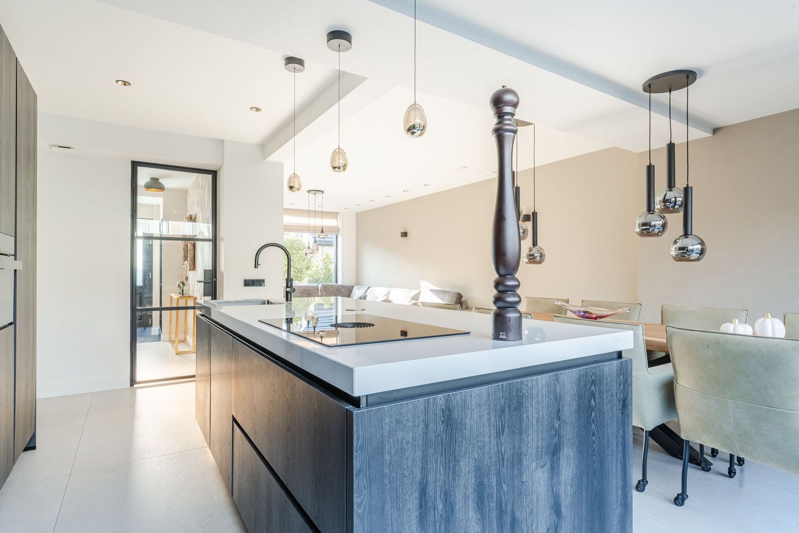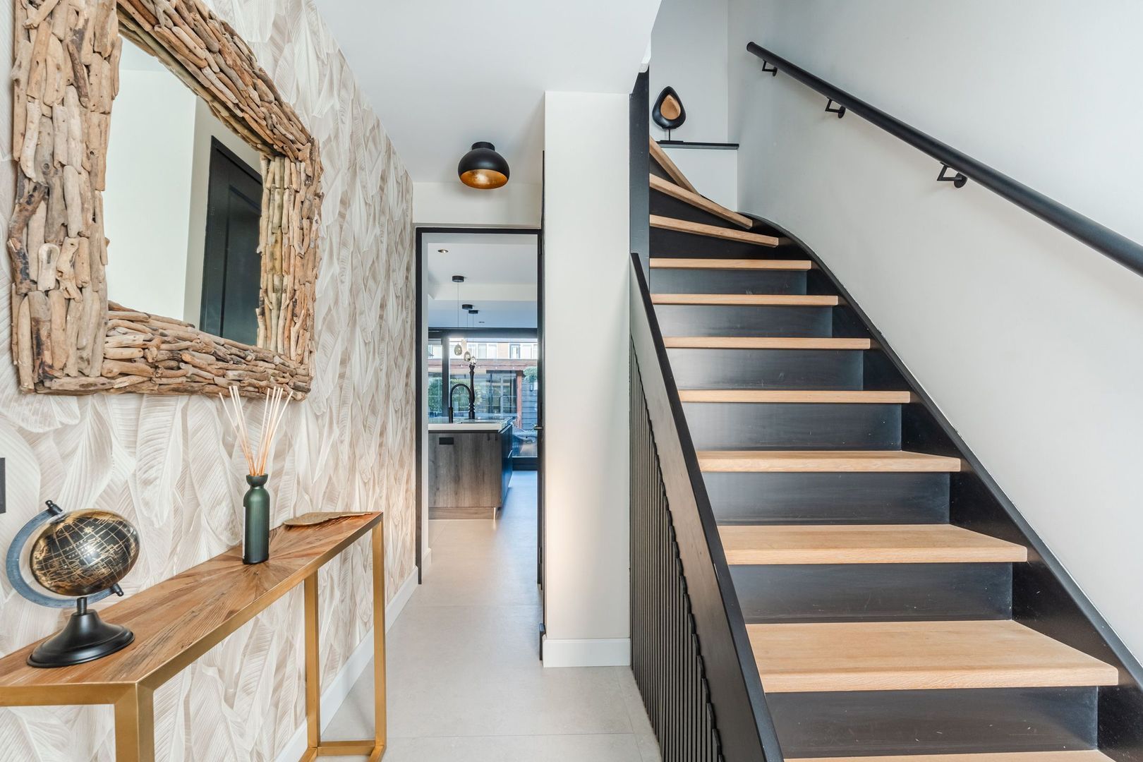 Begane grond: volledig gerenoveerd in 2023!! entree, hal met meterkast, een vernieuwde trapopgang met eiken treden, trapkast en aparte geheel betegelde toiletruimte (2023) v.v. wandcloset en fonteintje. Ruime uitgebouwde L-vormige woon-/eetkamer bestaande uit het zitgedeelte a/d voorzijde en een prachtige woonkeuken a/d achterzijde die middels een schuifpui toegang geeft tot de achtertuin. In de keuken is een fraaie donkere keukenopstelling (2023) geplaatst v.v. koelkast, vriezer, stoomoven, combi-magnetron en een kookeiland met vaatwasser, quooker, composieten aanrechtblad en een luxe BORA kookplaat met ingebouwde afzuiging. De fraai ingerichte achtertuin is gesitueerd op het noordwesten en v.v. een sfeervolle veranda met geïntegreerde berging. De begane grond is afgewerkt met lichtgrijze vloertegels (1,20 x 1,20) met vloerverwarming en sfeervolle inbouwverlichting.