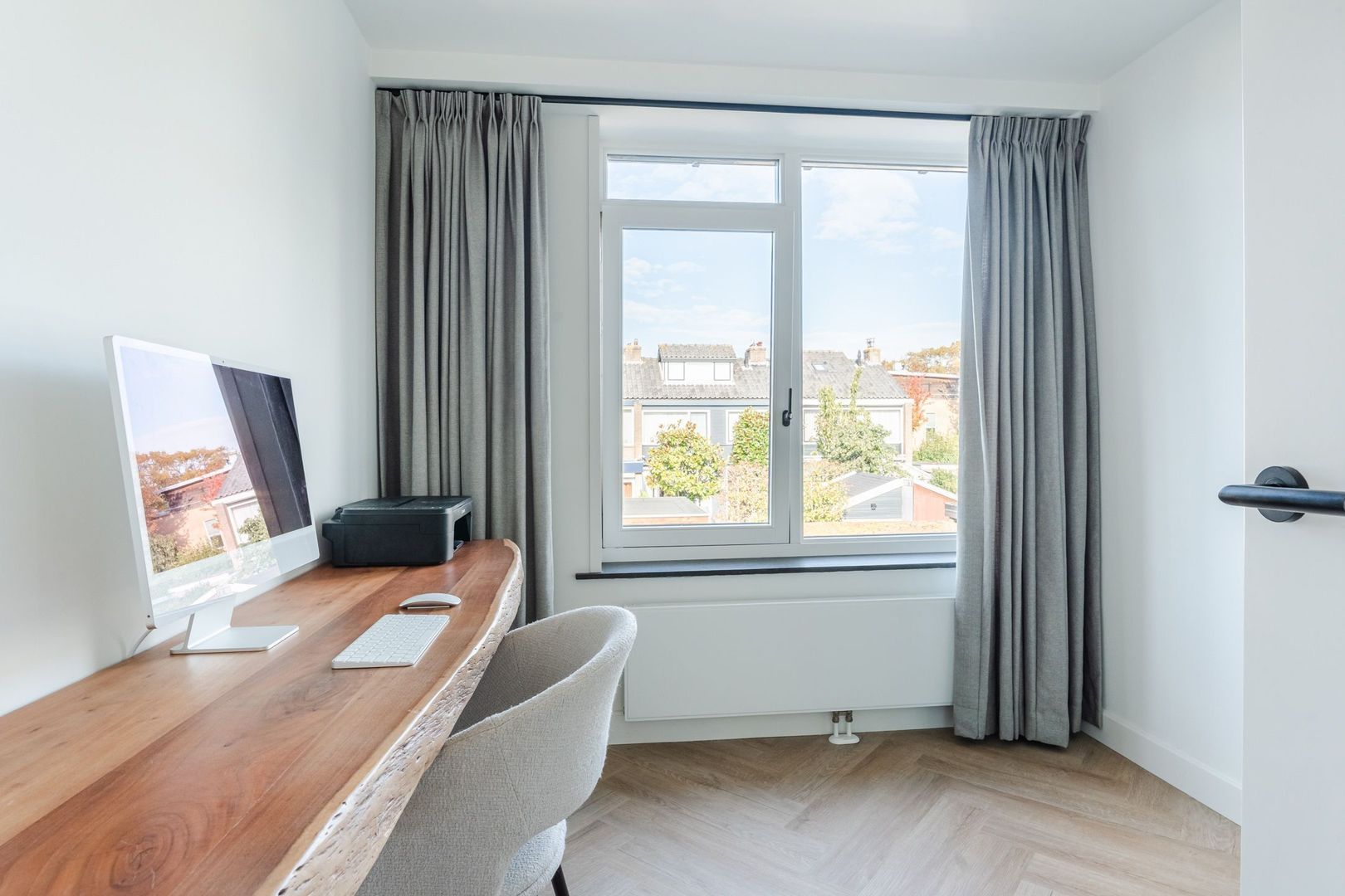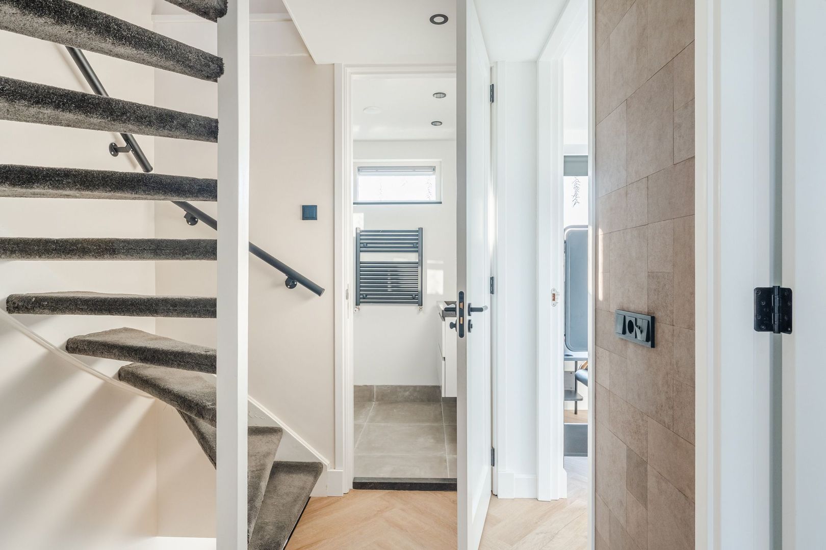 1e verdieping: overloop, de 1e slaapkamer is gelegen a/d voorzijde alsmede de modern ingerichte badkamer v.v. inloopdouche, wastafelmeubel, zwevend toilet en handdoekradiator. Verder bevinden zich op deze verdieping 2 slaapkamers a/d achterzijde waarvan er 1 is v.v. een aparte kast met daarin de voorbereidingen voor de balansventilatie. De 1e verdieping is afgewerkt met een PVC-vloer in visgraatmotief.