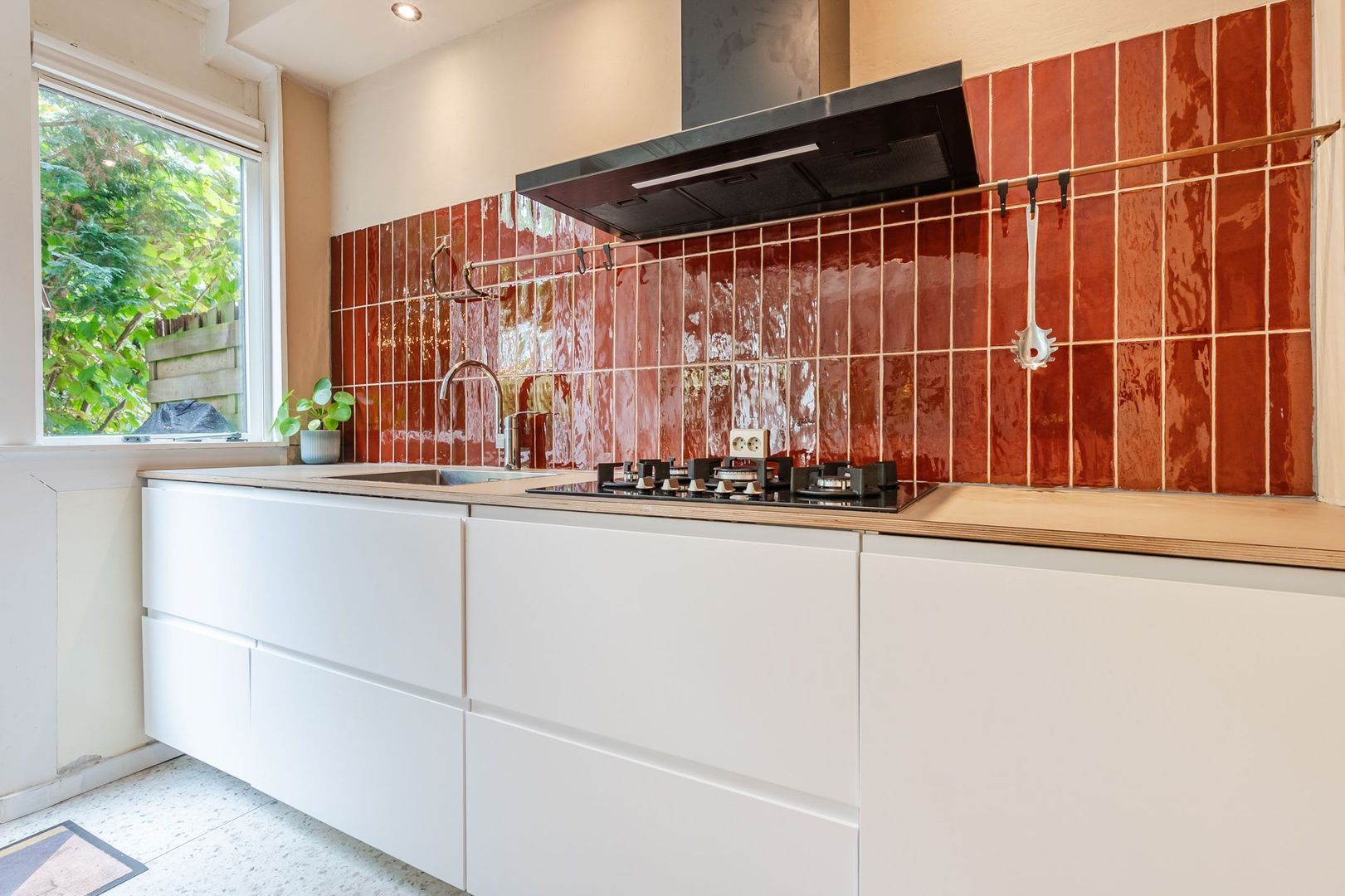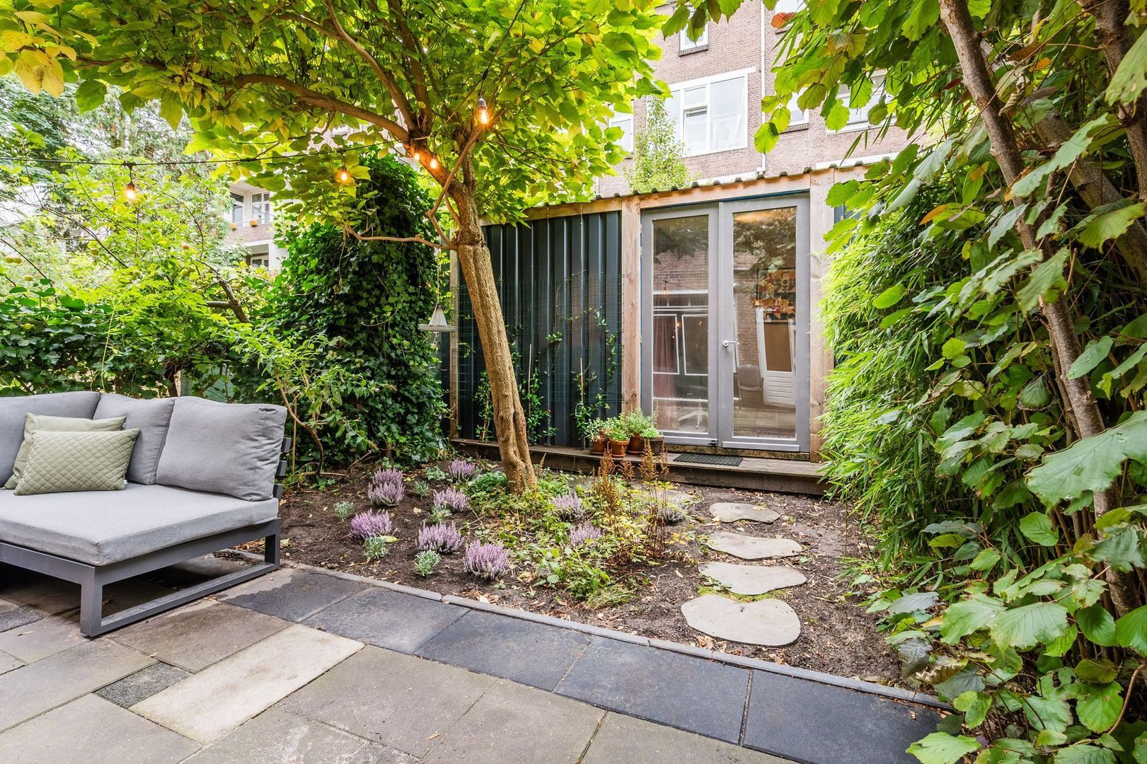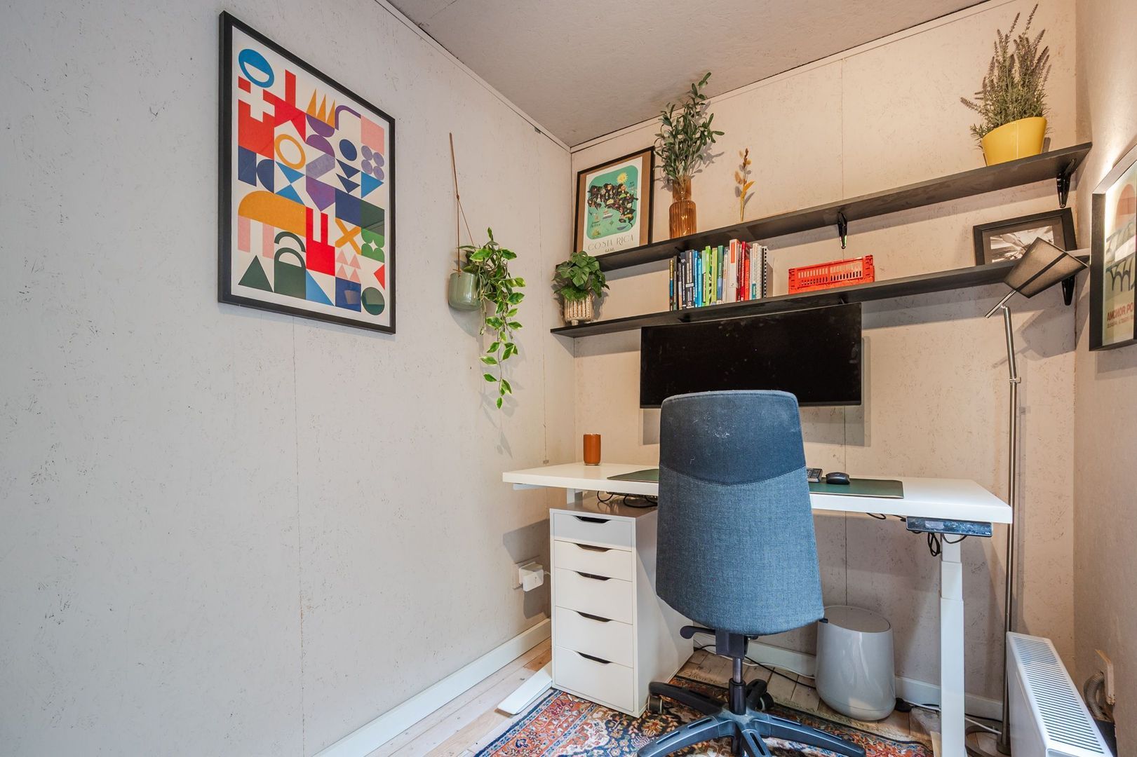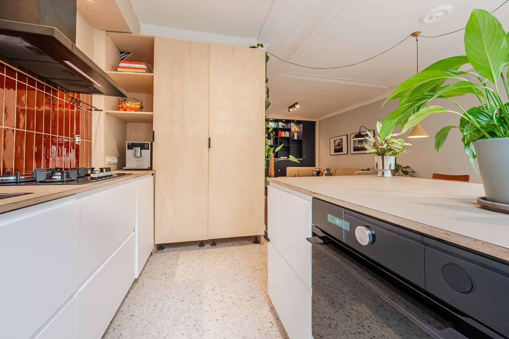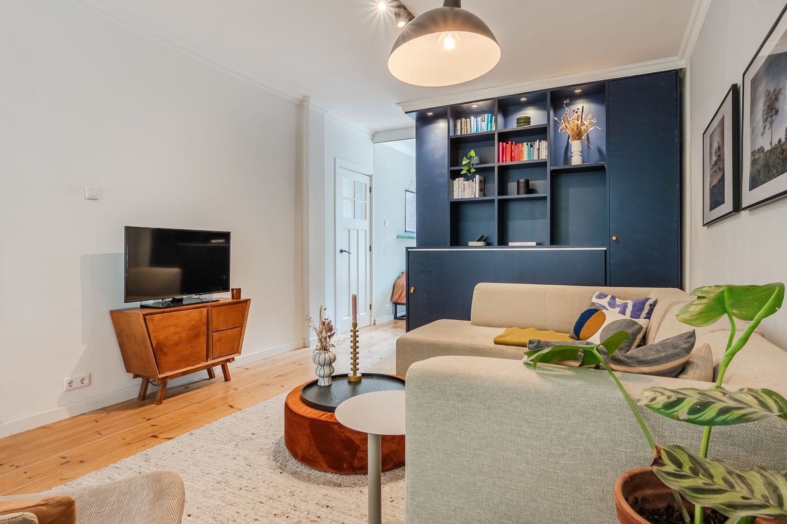 Begane grond: entree, tochtportaal met originele wandbetegeling en hal met aparte toiletruimte (2022) v.v. wandcloset en fonteintje. De slaapkamer bevindt zich aan de voorzijde van het appartement en is d.m.v. een vaste kastenwand afgesloten van de woon-/eetkamer. Ruime en lichte tuingerichte woon-/eetkamer die middels openslaande deuren toegang biedt tot de op het westen gelegen achtertuin v.v. een multifunctioneel geisoleerd tuinhuis die thans in gebruik is als thuiswerkplek annex klusruimte. De a/d achterzijde gelegen open keuken is v.v. een moderne L-vormige keukenopstelling (2021) v.v. 5-pits gaskookplaat, afzuigschouw, vaatwasser, ruimte met was-/drogeraansluiting en CV-opstelling en werkeiland met oven. De modern ingerichte badkamer (2024) is v.v. inloopdouche, wastafelmeubel en inbouwverlichting. Het appartement is afgewerkt met een sfeervolle houtenvloer.
