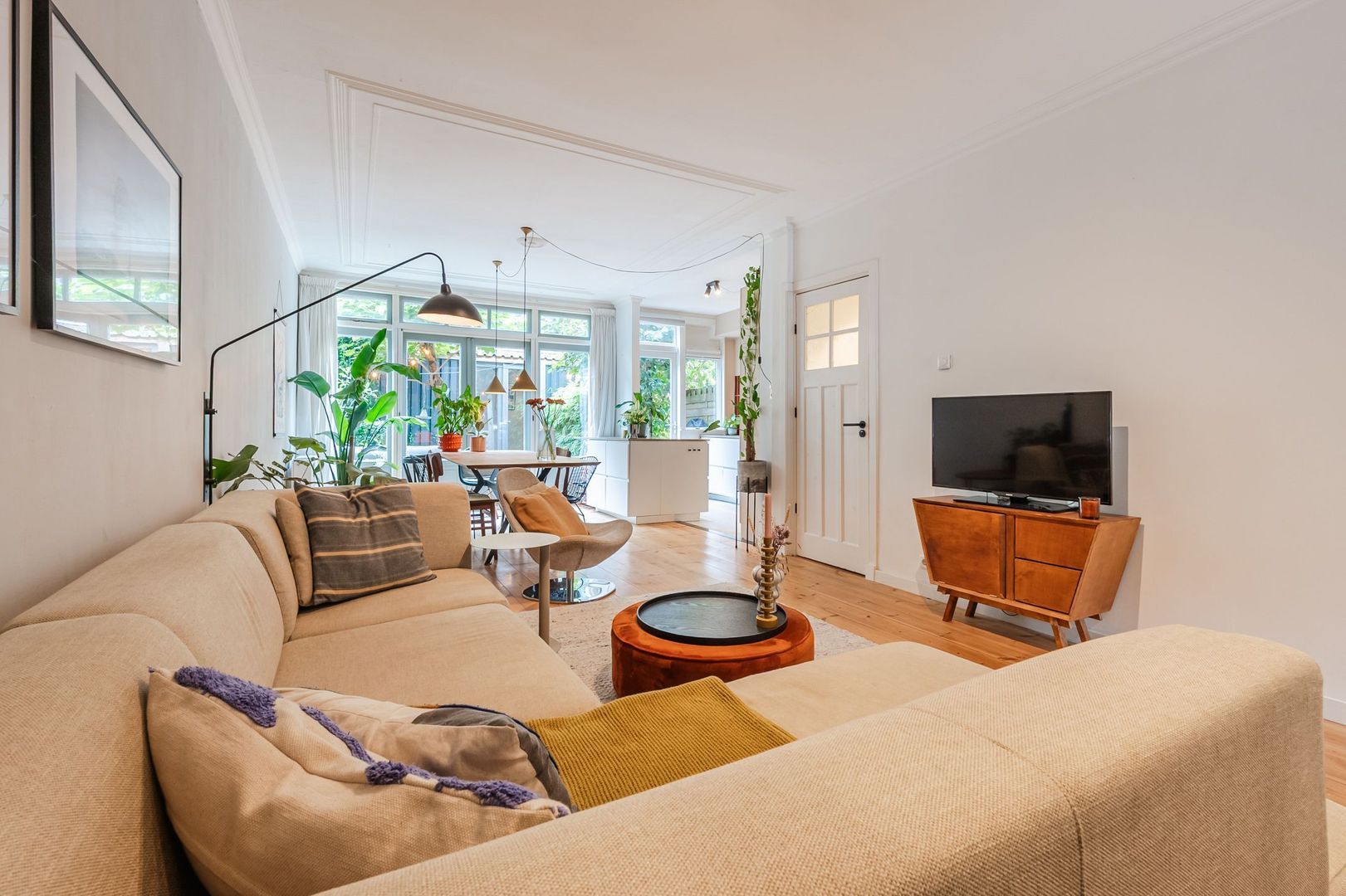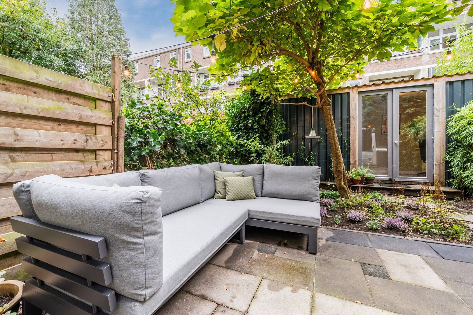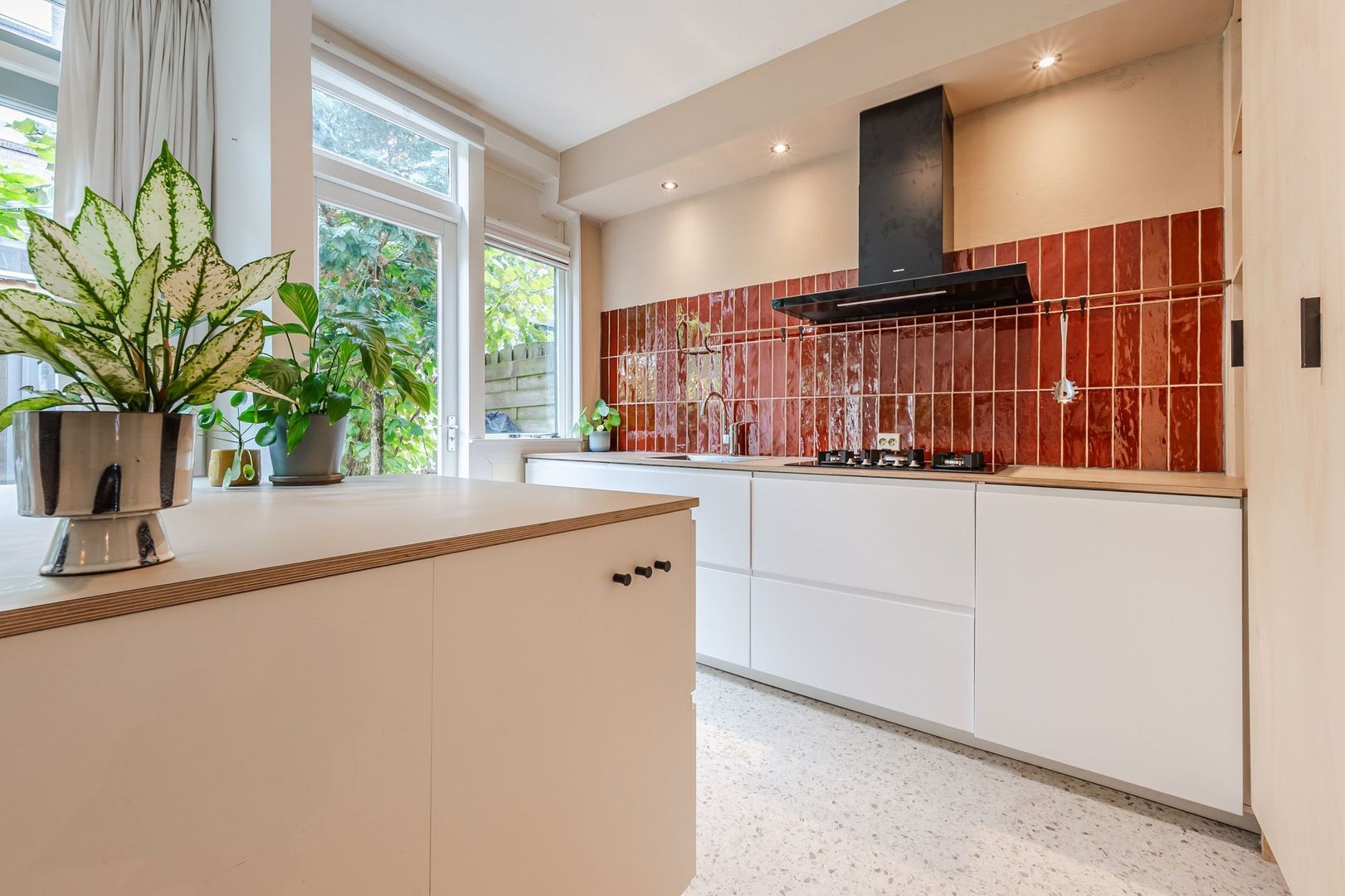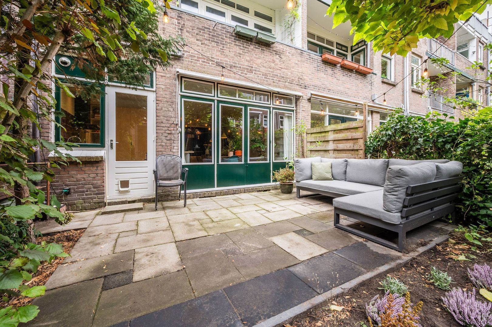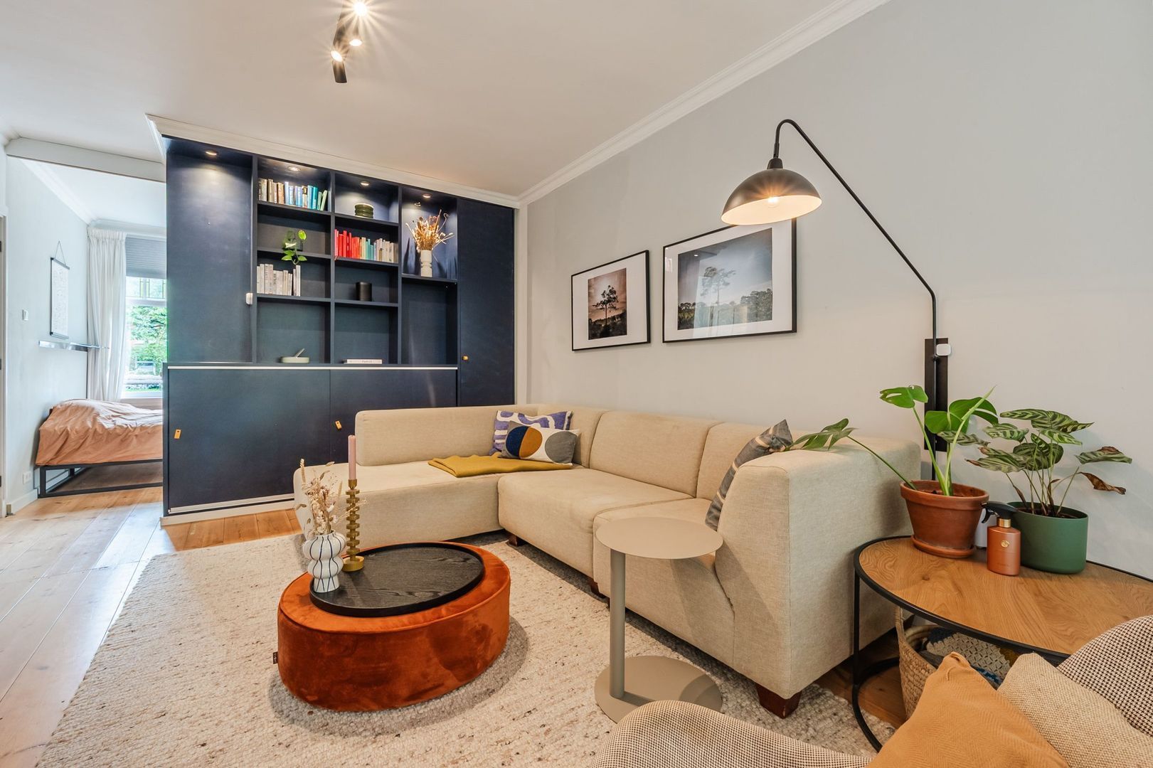 Begane grond: entree, tochtportaal met originele wandbetegeling en hal met aparte toiletruimte (2022) v.v. wandcloset en fonteintje. De slaapkamer bevindt zich aan de voorzijde van het appartement en is d.m.v. een vaste kastenwand afgesloten van de woon-/eetkamer. Ruime en lichte tuingerichte woon-/eetkamer die middels openslaande deuren toegang biedt tot de op het westen gelegen achtertuin v.v. een multifunctioneel geisoleerd tuinhuis die thans in gebruik is als thuiswerkplek annex klusruimte. De a/d achterzijde gelegen open keuken is v.v. een moderne L-vormige keukenopstelling (2021) v.v. 5-pits gaskookplaat, afzuigschouw, vaatwasser, ruimte met was-/drogeraansluiting en CV-opstelling en werkeiland met oven. De modern ingerichte badkamer (2024) is v.v. inloopdouche, wastafelmeubel en inbouwverlichting. Het appartement is afgewerkt met een sfeervolle houtenvloer.