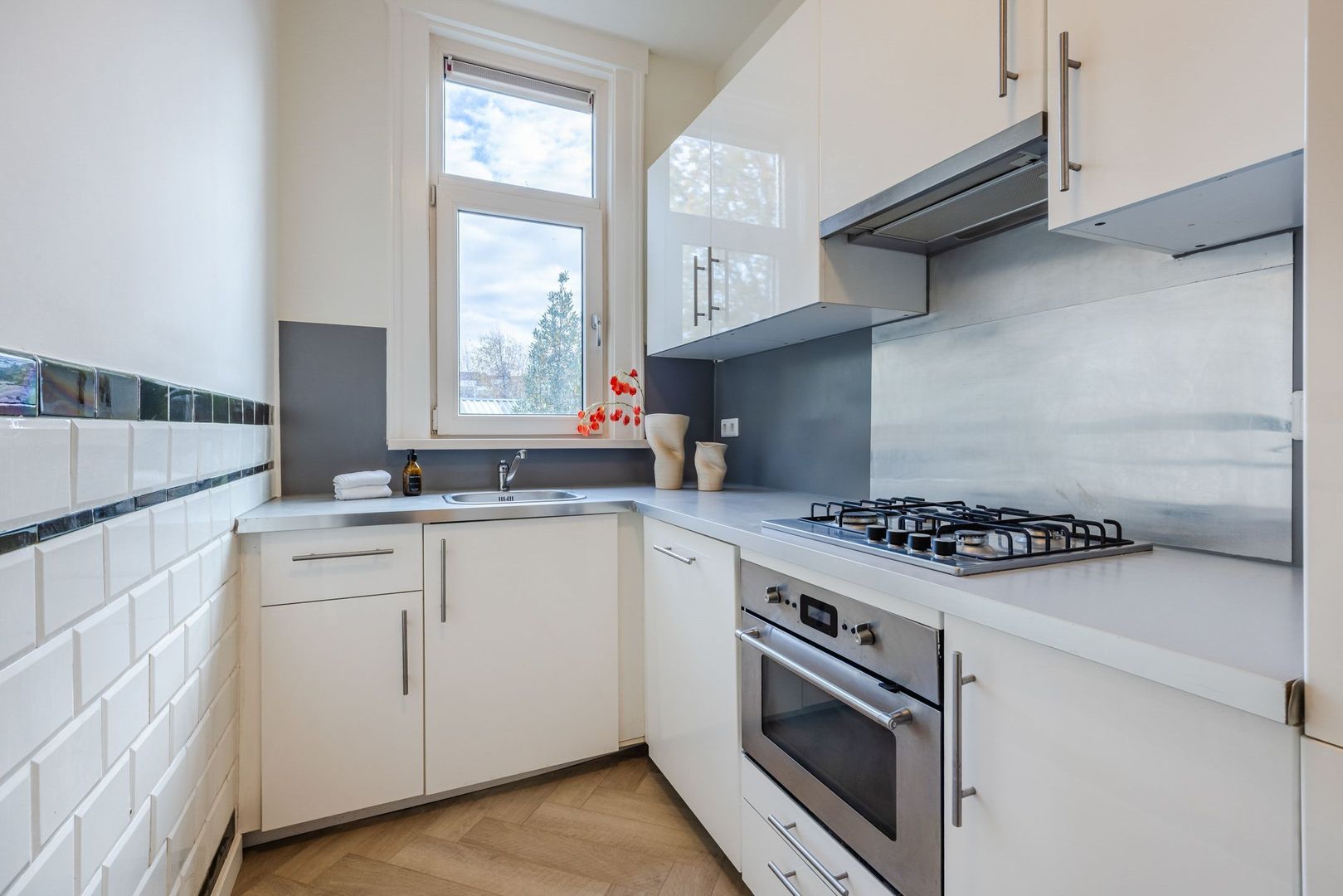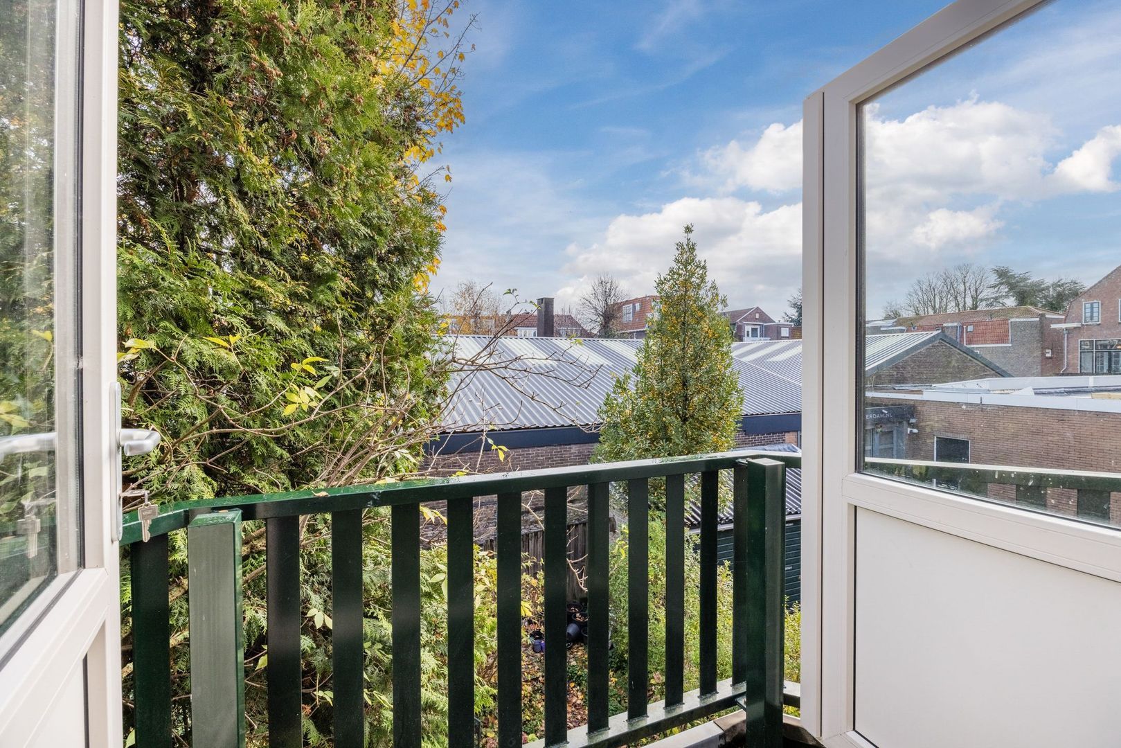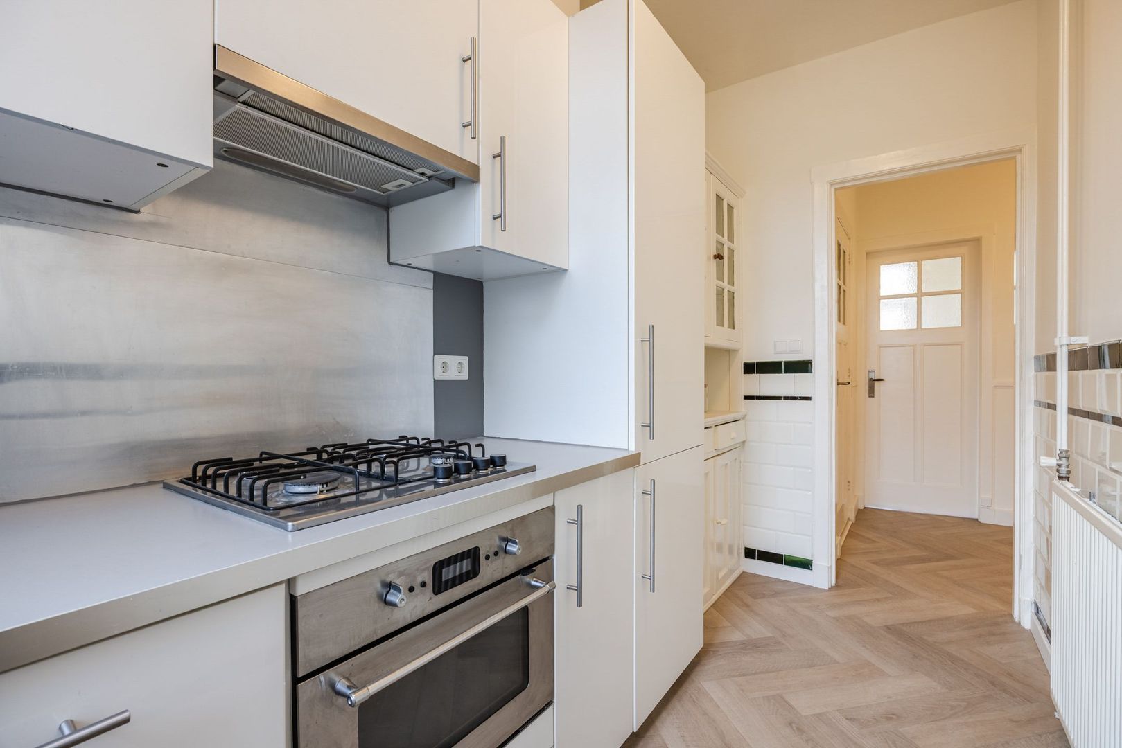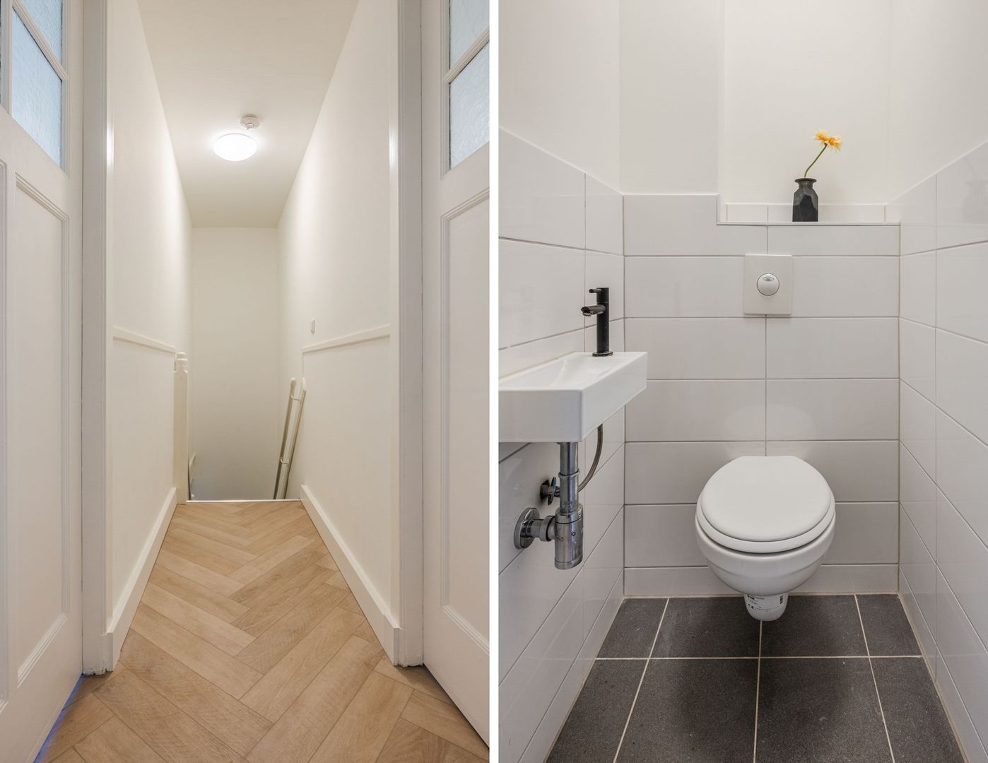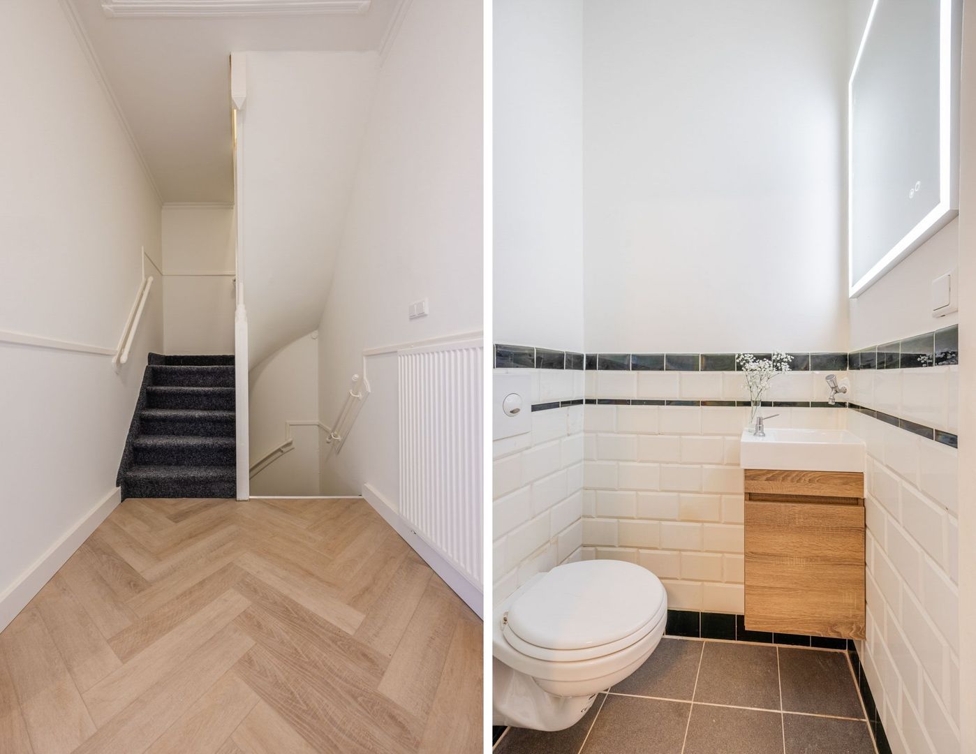 1e verdieping: ruime overloop met trapopgang naar de 2e verdieping en aparte toiletruimte met wandcloset en fonteintje. Aan de achterzijde bevindt zich een ruime woonkamer met openslaande deuren naar het balkon alsmede de gesloten keuken met een L-vormige keukenopstelling v.v. koel-/vriescombinatie, vaatwasser, oven, 4-pits gaskookplaat en afzuigkap. De mogelijkheid bestaat om de wand tussen de woonkamer en de gesloten keuken te verwijderen waardoor er een schitterende woonkeuken ontstaat. Verder bevindt zich op deze verdieping een tweetal kamers a/d voorzijde waarvan er één momenteel in gebruik is als aparte eetkamer en de andere als werkkamer. De 1e verdieping is afgewerkt met een prachtige laminaatvloer in visgraatmotief.