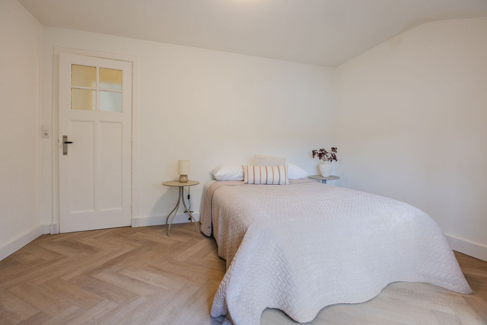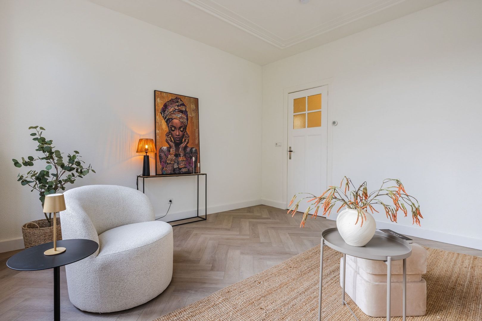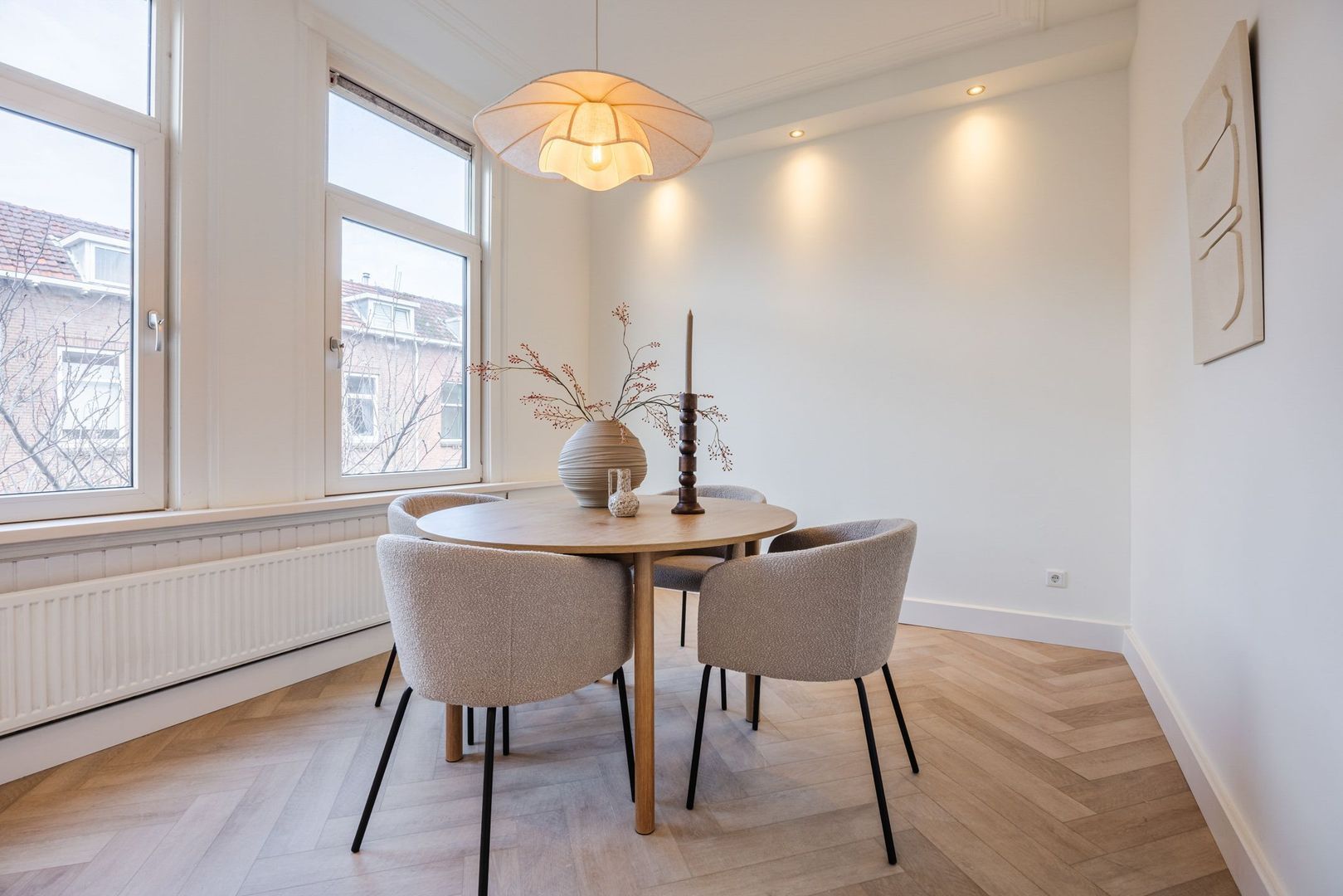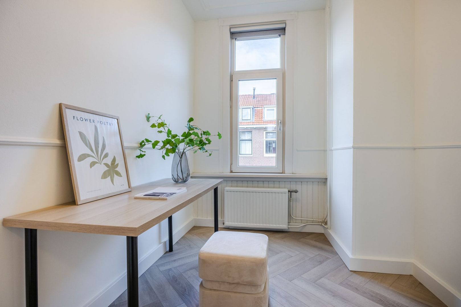 1e verdieping: ruime overloop met trapopgang naar de 2e verdieping en aparte toiletruimte met wandcloset en fonteintje. Aan de achterzijde bevindt zich een ruime woonkamer met openslaande deuren naar het balkon alsmede de gesloten keuken met een L-vormige keukenopstelling v.v. koel-/vriescombinatie, vaatwasser, oven, 4-pits gaskookplaat en afzuigkap. De mogelijkheid bestaat om de wand tussen de woonkamer en de gesloten keuken te verwijderen waardoor er een schitterende woonkeuken ontstaat. Verder bevindt zich op deze verdieping een tweetal kamers a/d voorzijde waarvan er één momenteel in gebruik is als aparte eetkamer en de andere als werkkamer. De 1e verdieping is afgewerkt met een prachtige laminaatvloer in visgraatmotief.