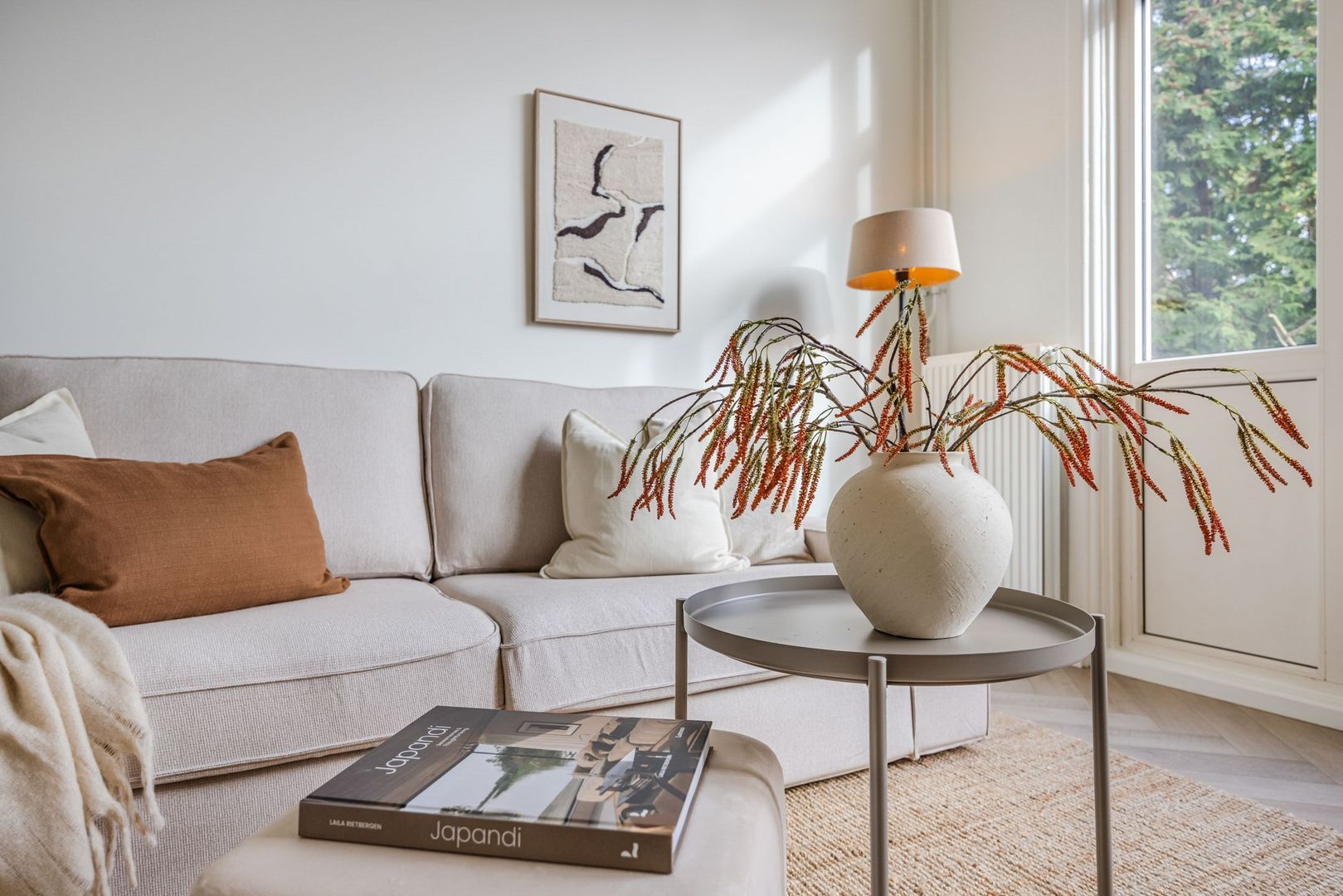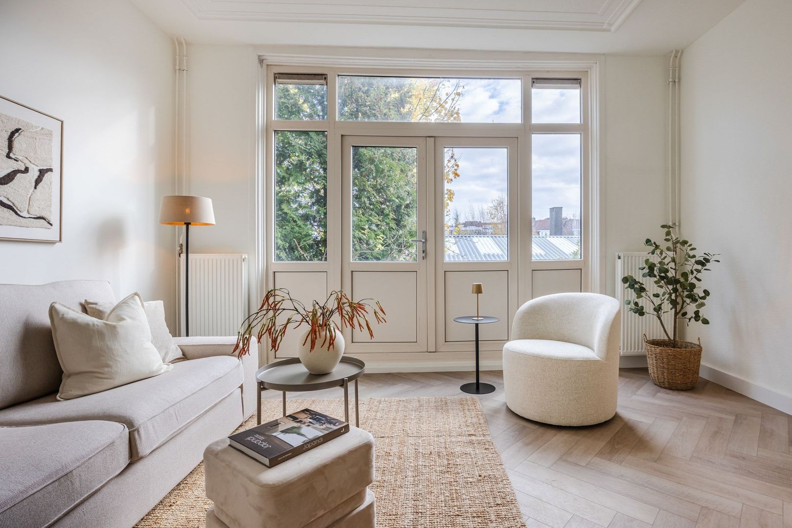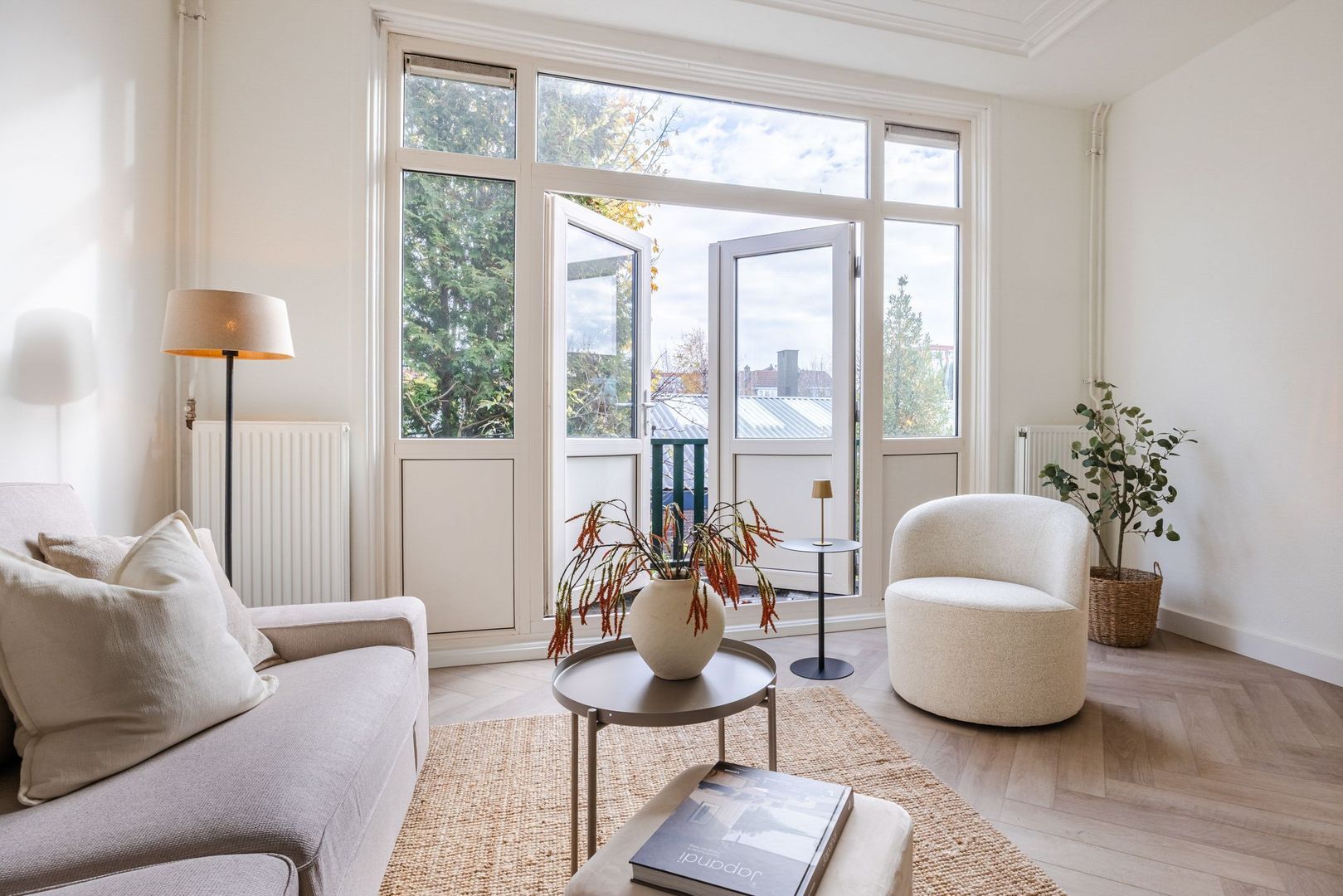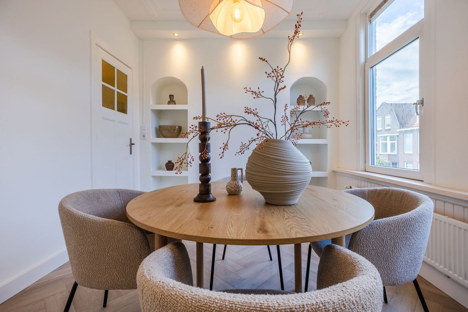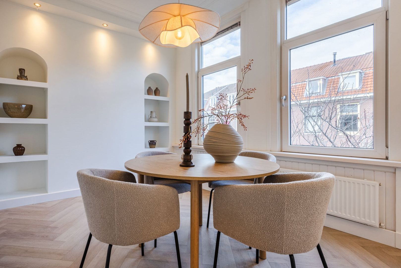 1e verdieping: ruime overloop met trapopgang naar de 2e verdieping en aparte toiletruimte met wandcloset en fonteintje. Aan de achterzijde bevindt zich een ruime woonkamer met openslaande deuren naar het balkon alsmede de gesloten keuken met een L-vormige keukenopstelling v.v. koel-/vriescombinatie, vaatwasser, oven, 4-pits gaskookplaat en afzuigkap. De mogelijkheid bestaat om de wand tussen de woonkamer en de gesloten keuken te verwijderen waardoor er een schitterende woonkeuken ontstaat. Verder bevindt zich op deze verdieping een tweetal kamers a/d voorzijde waarvan er één momenteel in gebruik is als aparte eetkamer en de andere als werkkamer. De 1e verdieping is afgewerkt met een prachtige laminaatvloer in visgraatmotief.