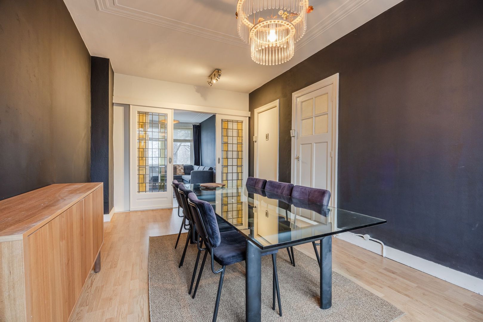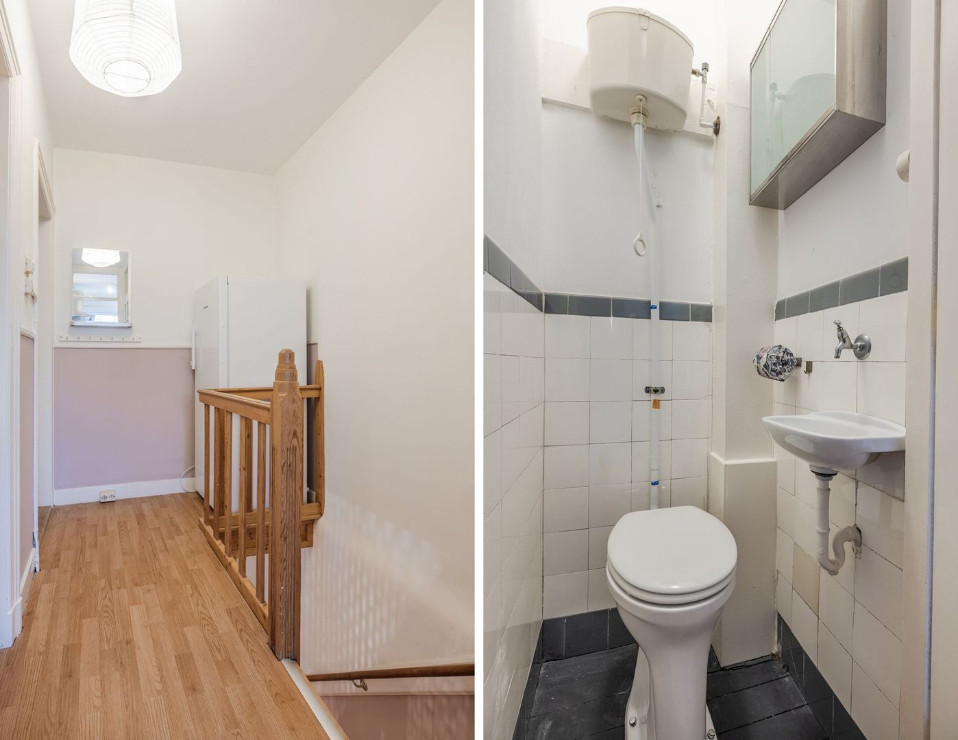 1e verdieping: overloop met apart toilet. De gesloten keuken is gelegen a/d achterzijde en is v.v. een standaard keukenblok. Sfeervolle woon-/eetkamer ensuite bestaande uit een eetkamer a/d achterzijde en een zitkamer a/d voorzijde die een prachtig uitzicht biedt over de “Bergsche Voorplas” en is v.v. een originele schouw. De 1e verdieping is afgewerkt met een laminaatvloer.