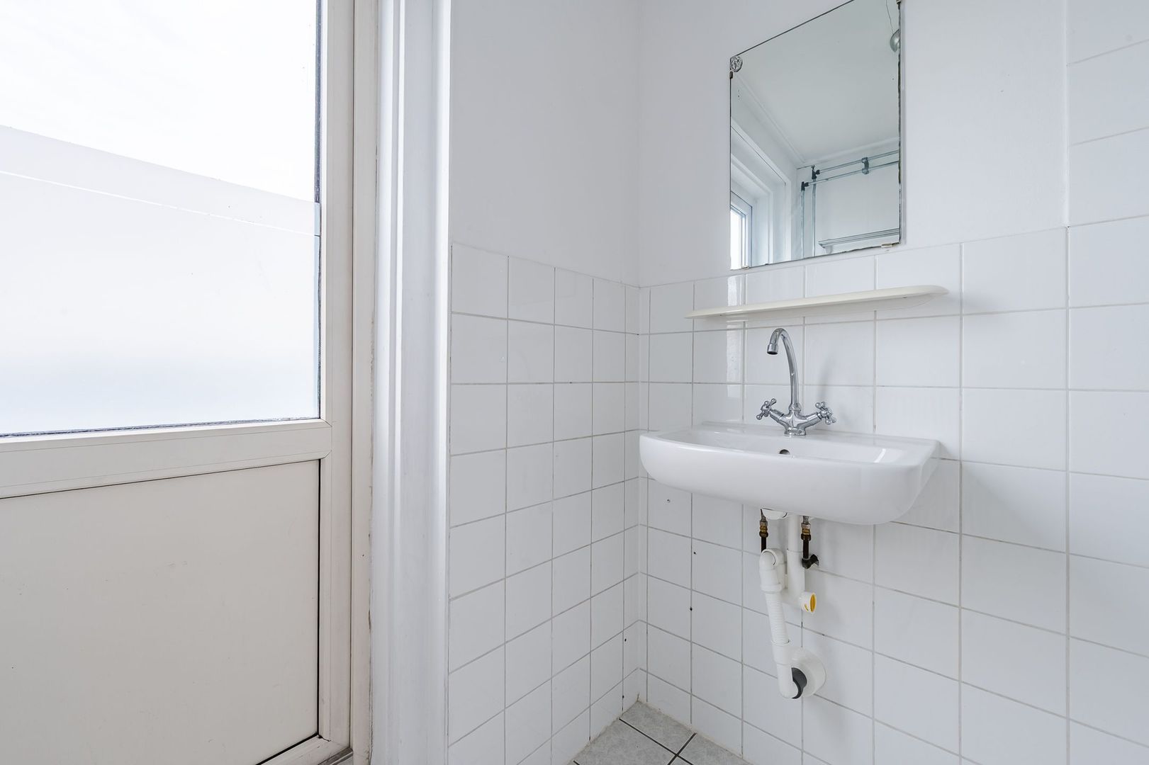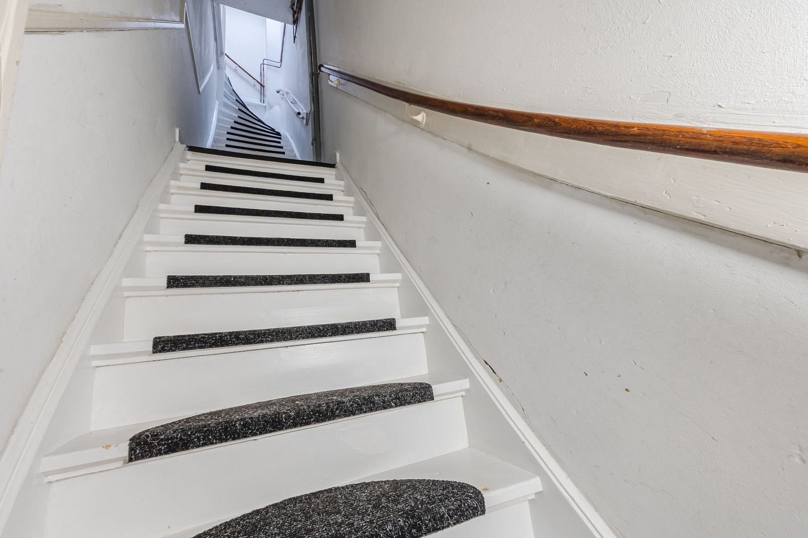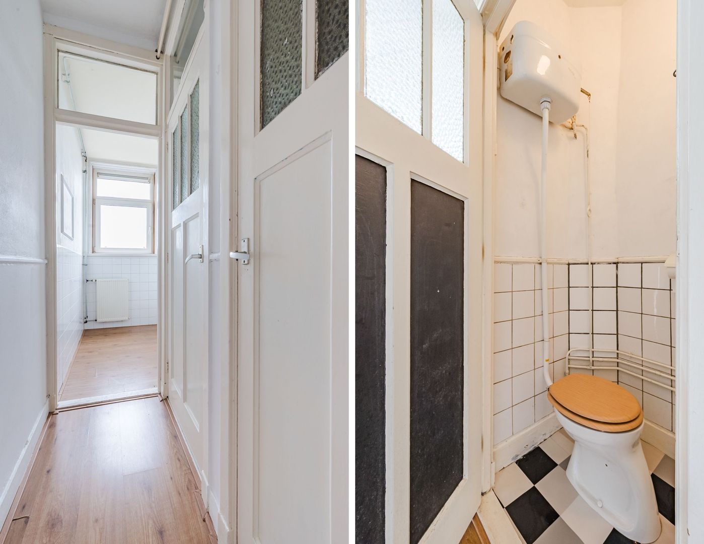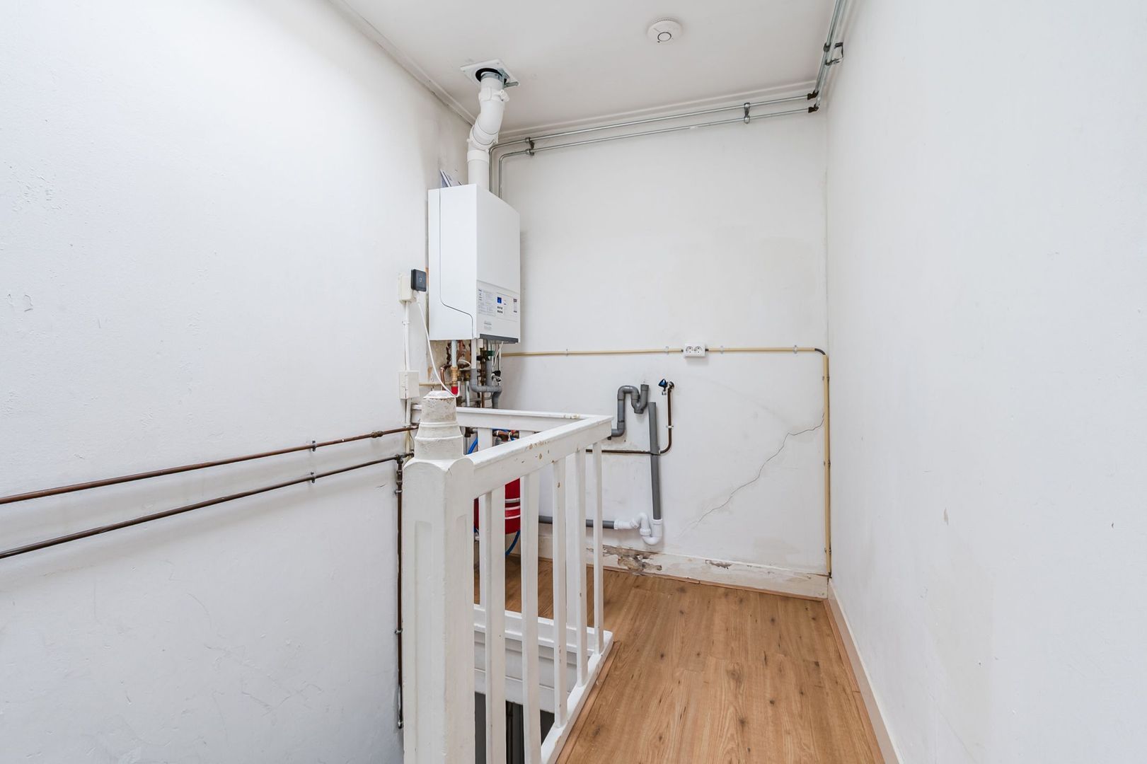 1e verdieping: ruime hal met apart toilet, trapkast en trapopgang naar de 3e verdieping. Heerlijk ruime en lichte woonkamer ensuite met marmeren schouw, vaste kast en erker in de voorgevel. De gesloten keuken bevindt zich a/d achterzijde en is v.v. een eenvoudig keukenblok. Tot slot bevindt zich op deze verdieping een slaap-/werkkamer a/d voorzijde met meterkast. De 1e verdieping is afgewerkt met een laminaatvloer.